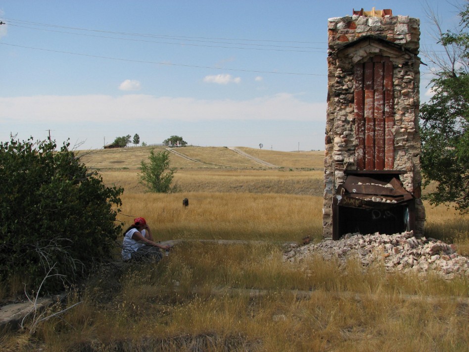 The site of the December 29, 1890 Wounded Knee Massacre can be seen here as well the mass grave burial site of the victims of Chief Bigfoot's band at the top of the hill. The ruins of the fireplace is what remains of the old Gildersleeves trading post and museum. It burned down near the end of the occupation of Wounded Knee in 1973 by the American Indian Movement who took possession of the town and Wounded Knee grounds for 71 days during a hostile stand-off with the United States Government.